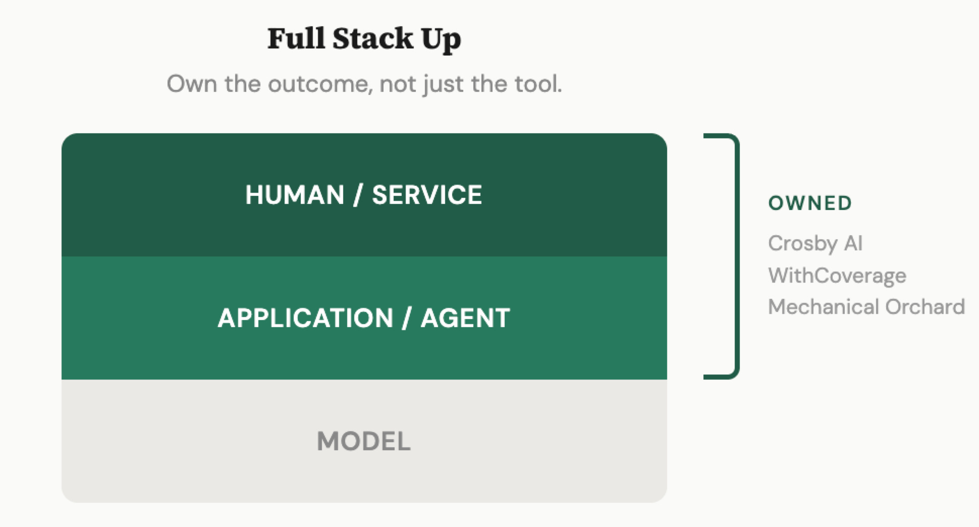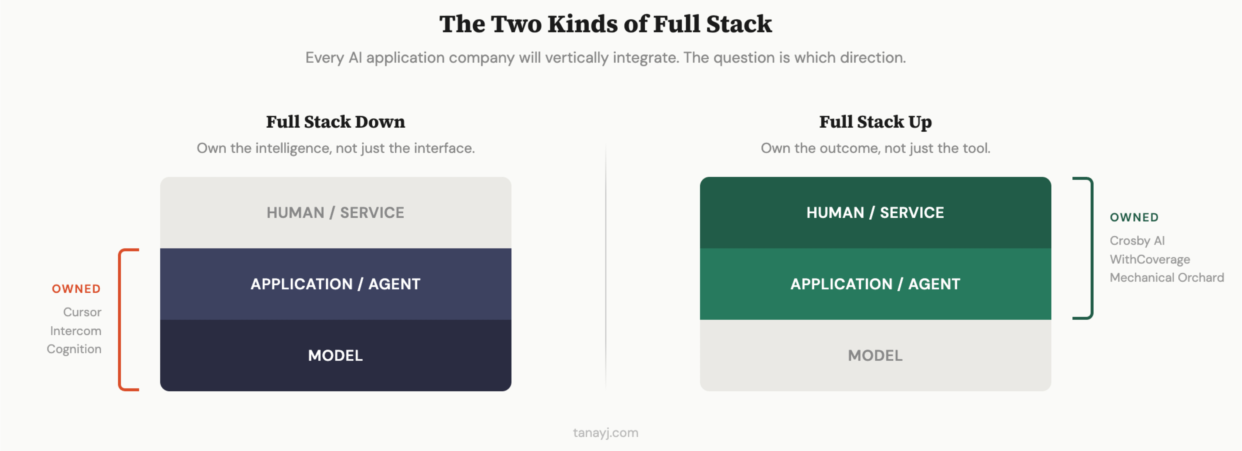 The second version of full-stack goes the other way. Instead of integrating into the model, the company integrates upward into the human or service layer. It sells true outcomes instead of software.