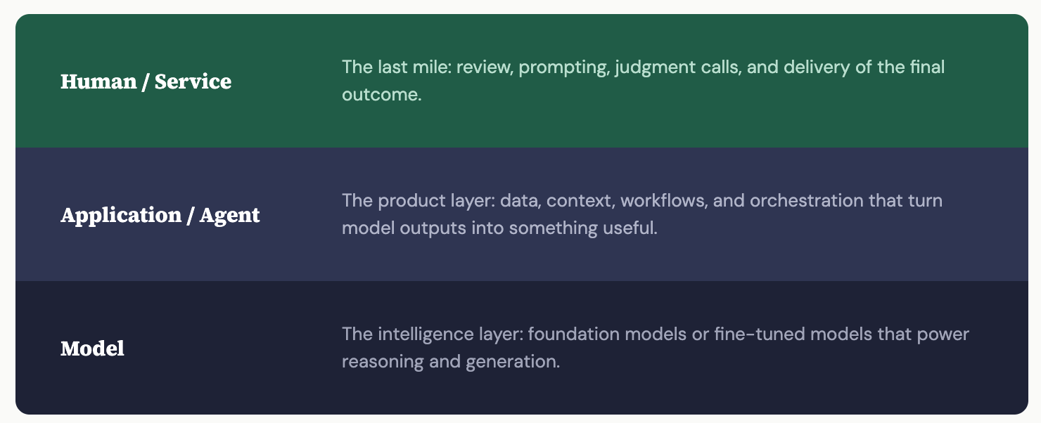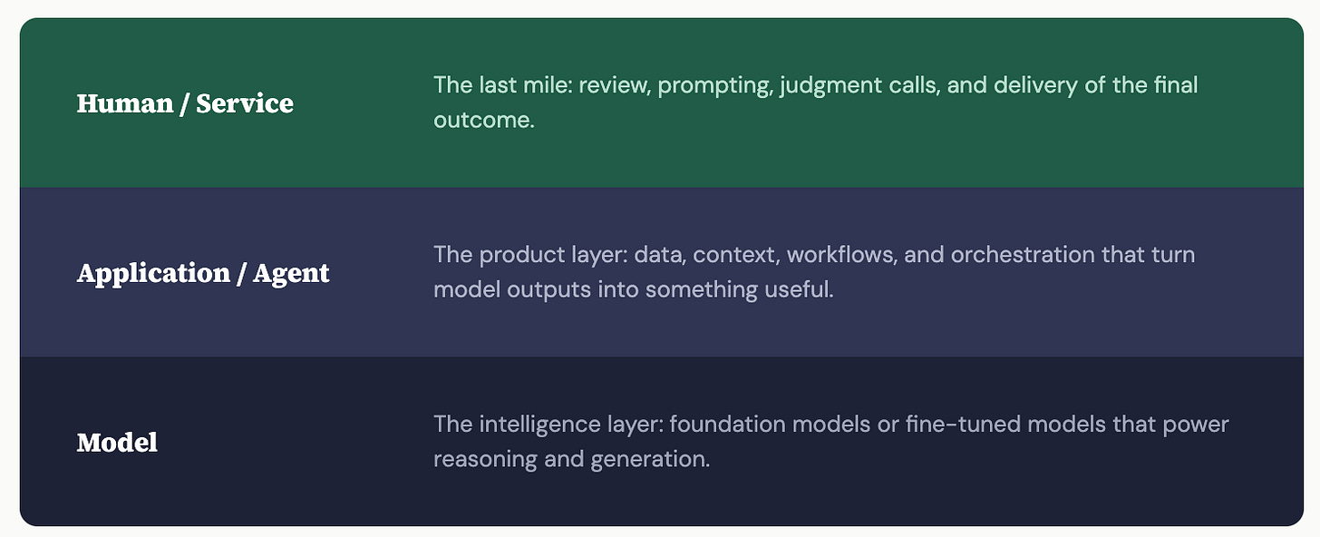 This path is especially interesting because it may eventually absorb even more of the stack. What starts as application plus service can, over time likely post-train specialized models too. As AI does more of the work, some of these companies may end up owning two layers at first, then increasingly all three.