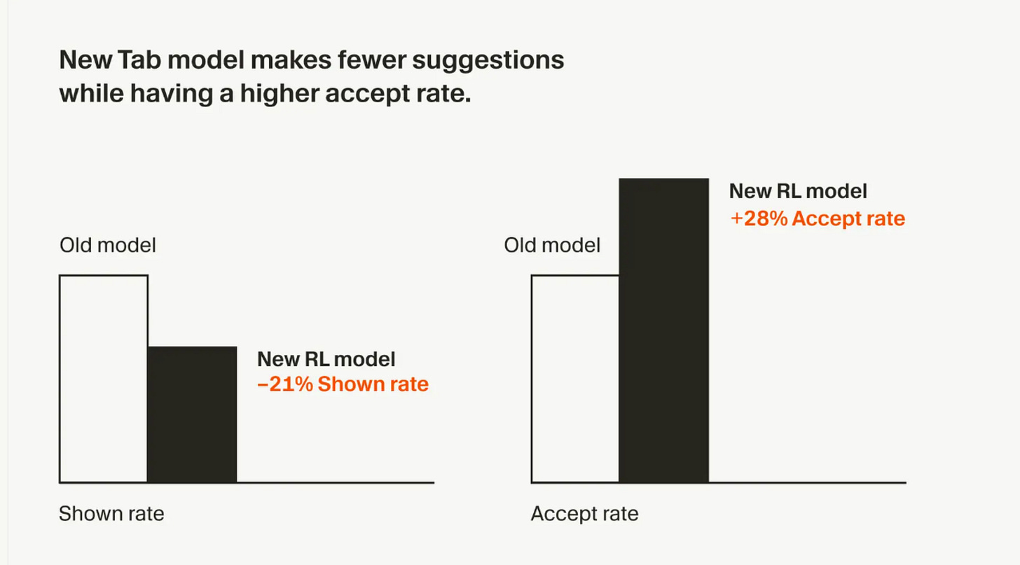 Coding is a great example of an application category with lots of these trajectories given the adoption. Cursor was able to use the feedback from their tab model to train an improved one using online RL, as they describe in this piece. This is how many application companies will actually see the benefit from the data they collect.