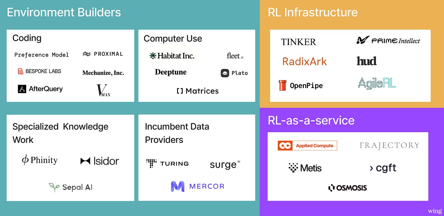 Startups building in this area include companies building tooling to simplify RL post-train models such as Miles from RadixArk and Tinker from Thinking Machines to all-in-one compute platforms like Prime Intellect or tooling to make building environments themselves easier such as Hud.