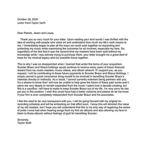 “This just happened to me without my approval, consultation or consent. After I was denied the chance to purchase my music outright, my entire catalog was sold to Scooter Braun’s Ithaca Holdings in a deal that I’m told was funded by the Soros family, 23 Capital and that Carlyle Group. Yet, to this day, none of these investors have bothered to contact me or my team directly — to perform their due diligence on their investment. On their investment in me. To ask how I might feel about the new owner of my art, the music I wrote, the videos I created, photos of me, my handwriting, my album designs.”