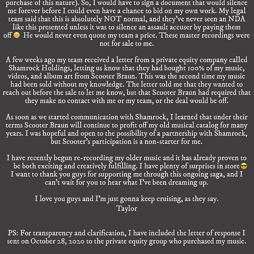 By re-recording her albums, Taylor is creating new value through the renewed interest in these songs (and the new songs contained in these albums). But she is also able to shift over 60%+ of the value of the masters of the original album to the new re-recorded albums which she owns the masters of.