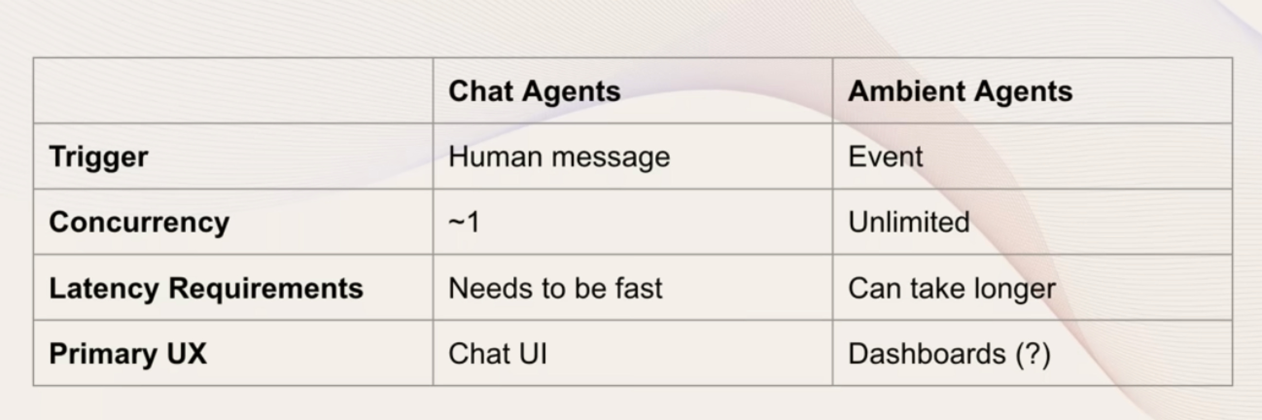 Ambient: They are always running in some sense, and responding to some changes in some input. They wake up because the world changed, not just because you typed a prompt in. A new email arrives, a web page changes, a metric moves, a calendar event appears.