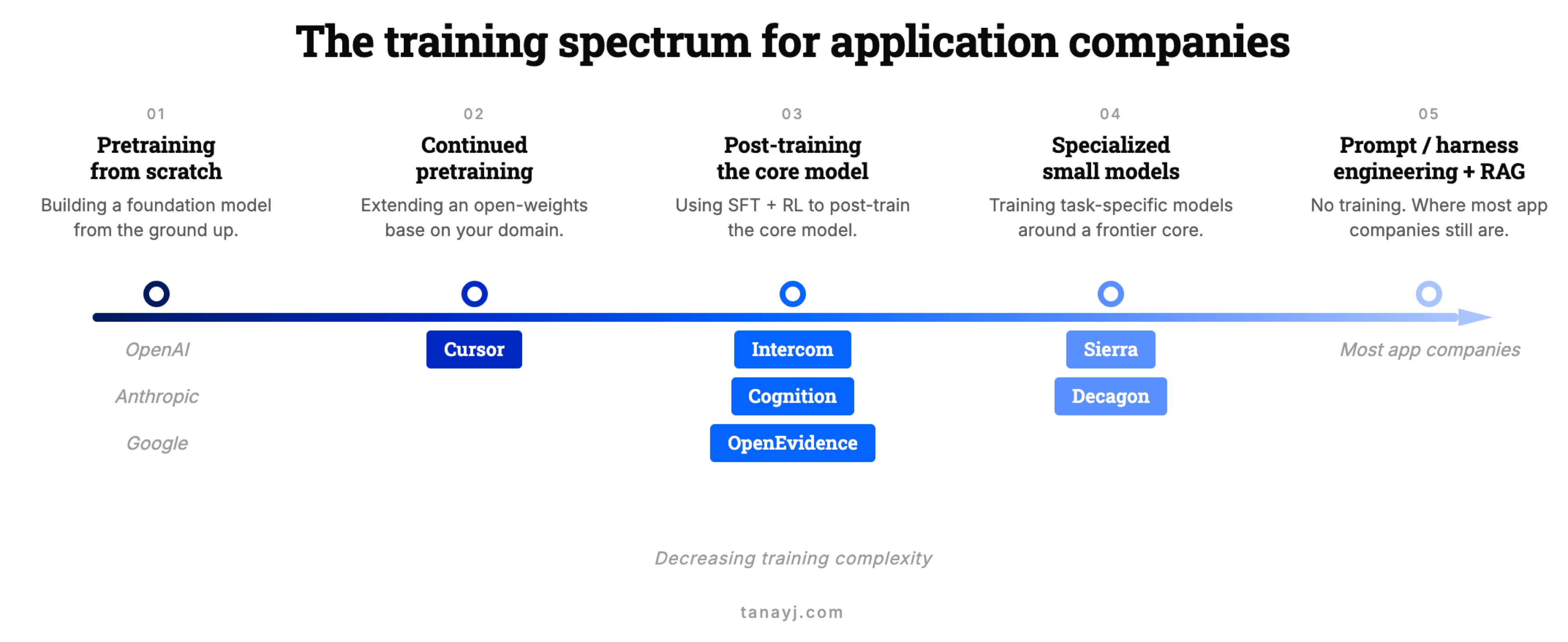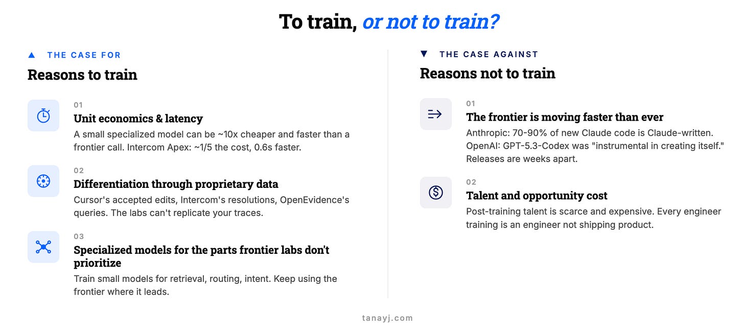 The companies integrating down into the model layer (Cursor, Intercom, Sierra, Decagon, Cognition, OpenEvidence) aren’t doing it because they like training models. They’re doing it because at their scale, with their traces, the economics and differentiation arguments finally pencil out. And almost all of them are doing it as post-training, not pretraining from scratch.