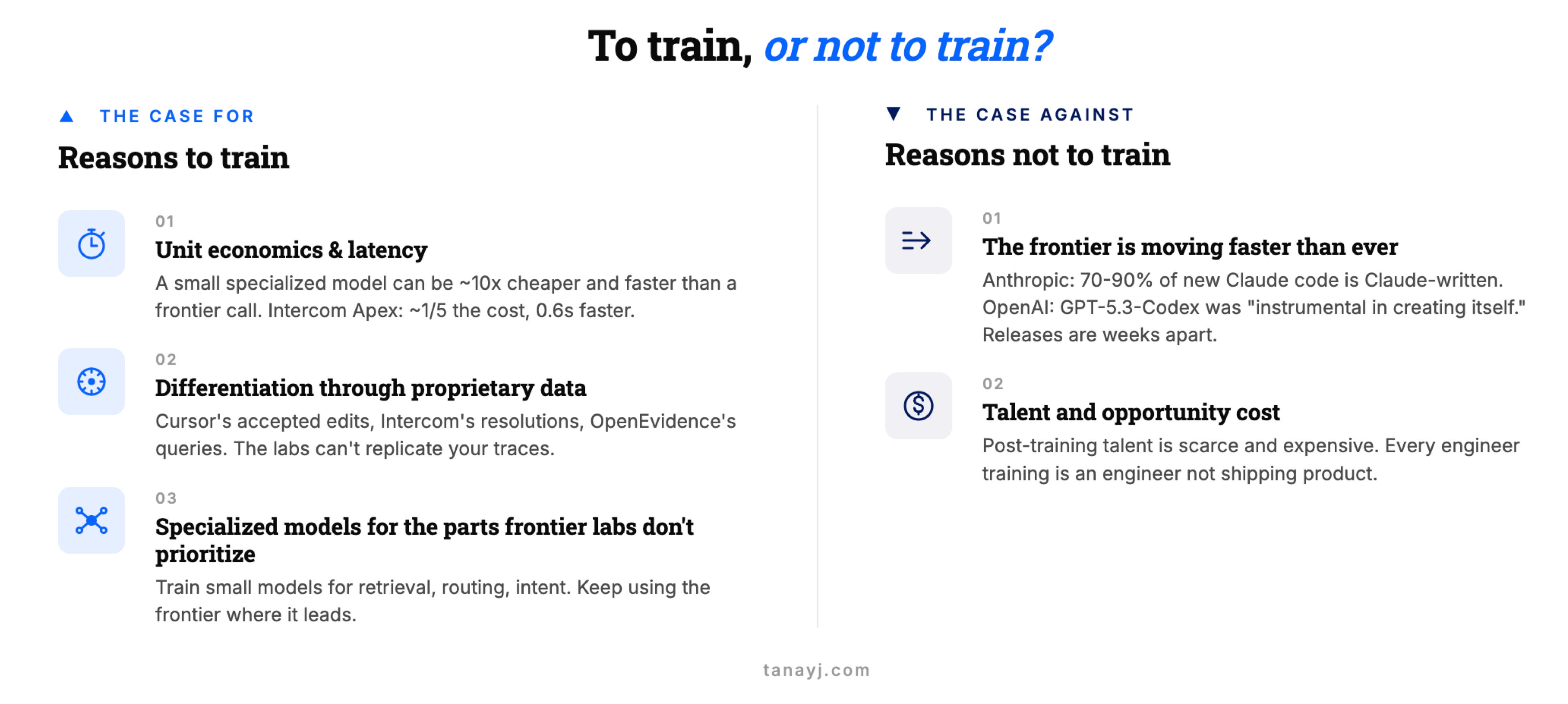 The biggest reason to be careful: your post-trained model may not survive the next base-model release from the lab. The labs are now releasing new models faster than ever, because the labs themselves are using their own models to build the next ones.