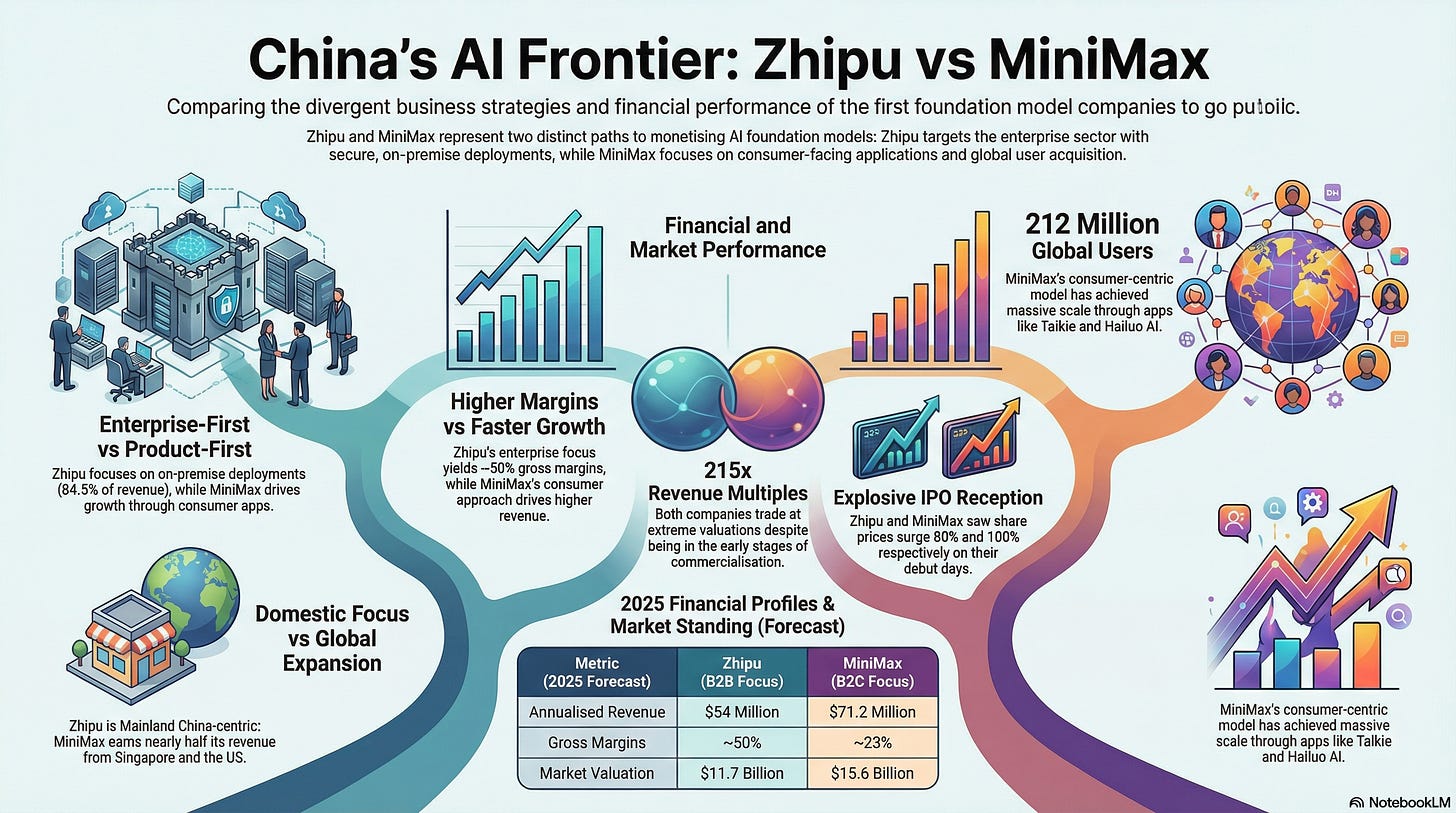 Two Chinese foundation model labs, Zhipu and MiniMax, went public over the past few weeks, with Zhipu becoming the first foundation model company to IPO globally. What stood out to me reading both filings is the different approaches they took to turn their models and capabilities into a real business.