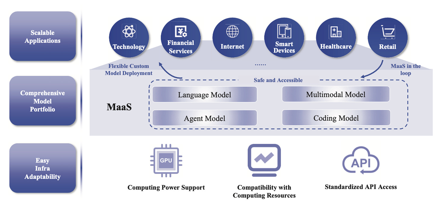Zhipu is a deployment-first model company. The core asset is the GLM model family, and the filing emphasizes a set of newer releases like GLM-4 and its variants, including lighter versions and vision-capable versions, plus newer iterations in the GLM-4.x line which are most popular for their coding abilities. Zhipu is very explicit that it delivers capability through public cloud, private cloud, and on-prem deployments, and it pairs that with professional services. In other words, the “product” is often the model deployment plus a set of services that make it usable inside a real enterprise environment. They talk about their “Model as a Service” platform, which is highlighted below.